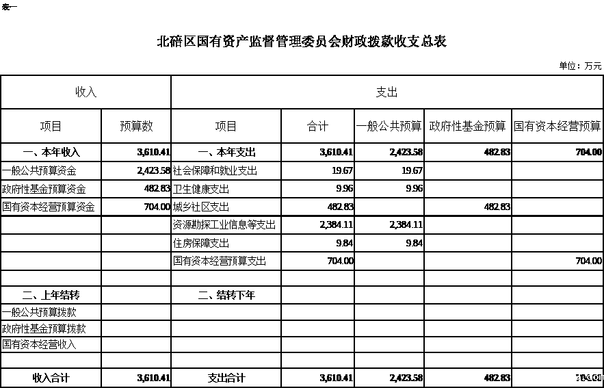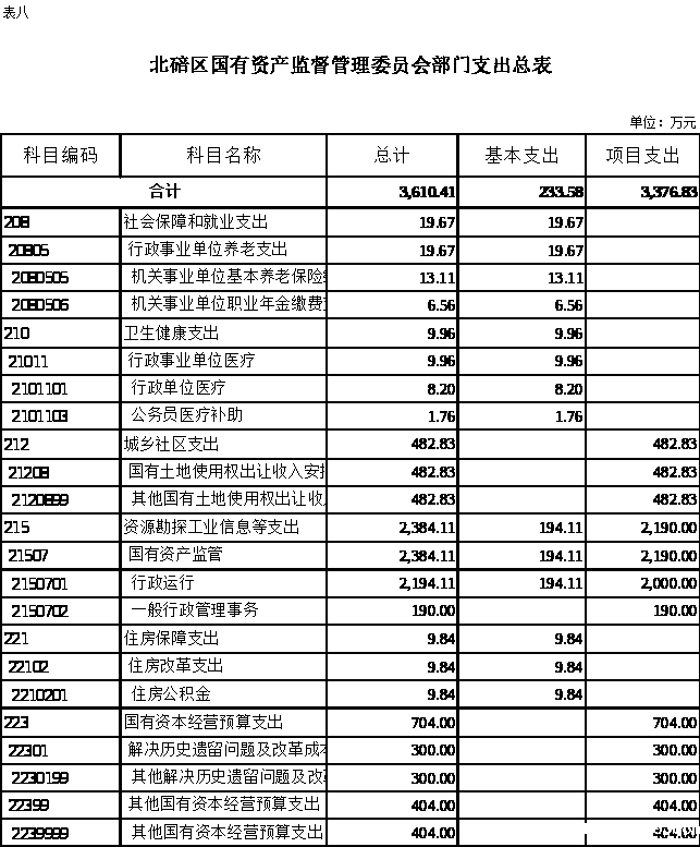 (二)支出预算:2022年年初预算数3610.41万元,其中:资源勘探工业信息等支出2384.11万元,社会保障和就业支出19.67万元,卫生健康支出9.96万元,住房保障支出9.84万元,城乡社区支出482.83万元,国有资本经营预算支出704万元。支出预算较2021年增加1559.16万元,主要是基本支出预算增加27.33万元,项目支出预算增加1531.83万元。