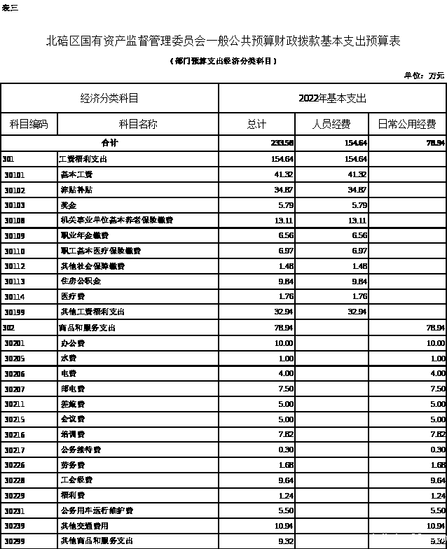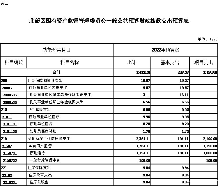 2022年一般公共预算财政拨款收入2423.58万元,一般公共预算财政拨款支出2423.58万元,比2021年增加372.33万元。其中:基本支出233.58万元,比2021年增加27.23万元,主要原因是增人增资,主要用于保障在职人员工资福利及社会保险缴费,在职人员工资福利及社会保险缴费,保障部门正常运转的各项商品服务支出等;项目支出2190万元,比2021年增加345万元,主要原因是6+2企业专项资金增加,新增档案室硬件、 软件设备及整理费用专项经费等,主要用于国有企业、国有资产的监督管理等重点工作。