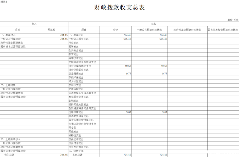 (一)收入预算:2020年年初预算数704.45万元,其中:一般公共预算拨款704.45万元,政府性基金预算拨款0万元,国有资本经营预算收入0万元,事业收入0万元。