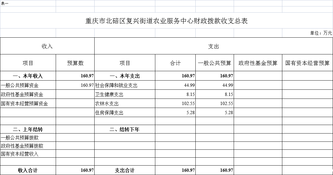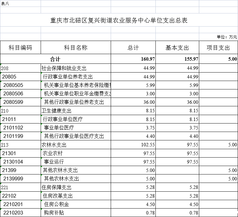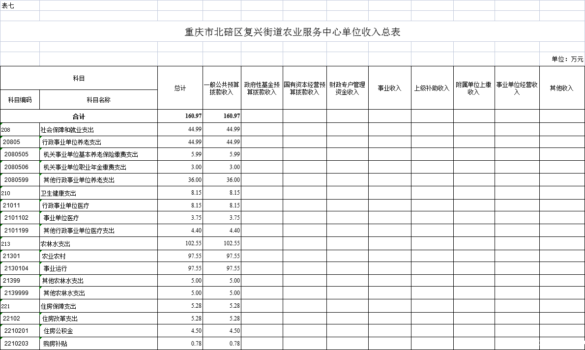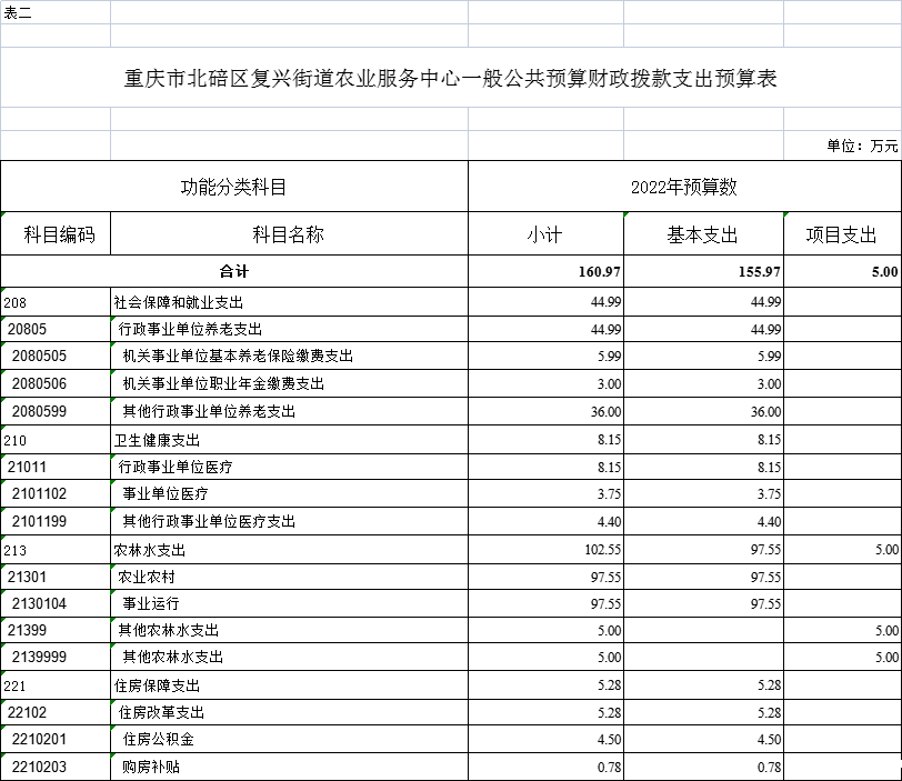2022年一般公共预算财政拨款收入160.97万元,一般公共预算财政拨款支出160.97万元。其中:基本支出155.97万元,主要用于保障重庆市北碚区复兴街道农业服务中心在编在职人员工资福利及社会保险缴费,保障单位正常运转的各项商品服务支出,项目支出5万元。